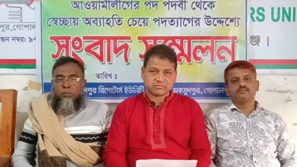 বাংলার নয়ন সংবাদ গোপালগঞ্জের মুকসুদপুরে সংবাদ সম্মেলন করে দলীয় পদ-পদবি থেকে পদত্যাগ করেছে আরো তিন আওয়ামী লীগ নেতা। শনিবার (২২ নভেম্বর) বিকালে মুকসুদপুর রিপোর্টার্স ইউনিটিতে এ সংবাদ সম্মেলন অনুষ্ঠিত হয়।